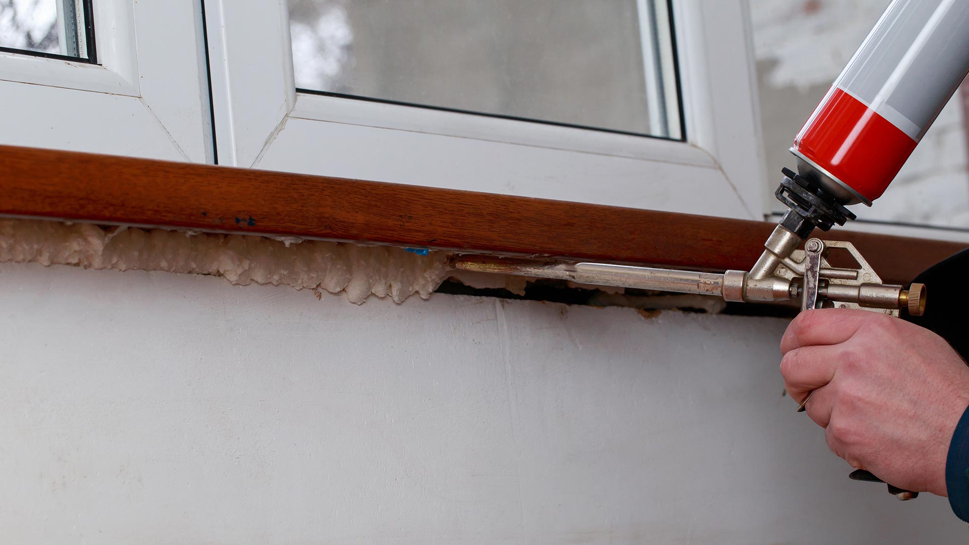 Spray foam insulation applied to seal gaps around a door frame